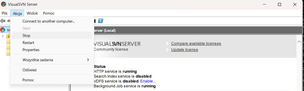 A w przypadku, gdzie mamy jeszcze zainstalowane oprogramowanie typu kontrola wersji. VisualSVN, to przed uruchomieniem XAMPP-a, należy zatrzymać jego działanie.