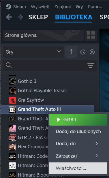 2. Z listy posiadanych przez siebie gier, po lewej stronie. Klikasz prawym przyciskiem myszy na pozycji „Grand Theft Auto 3” i z menu kontekstowego wybierasz właściwości.