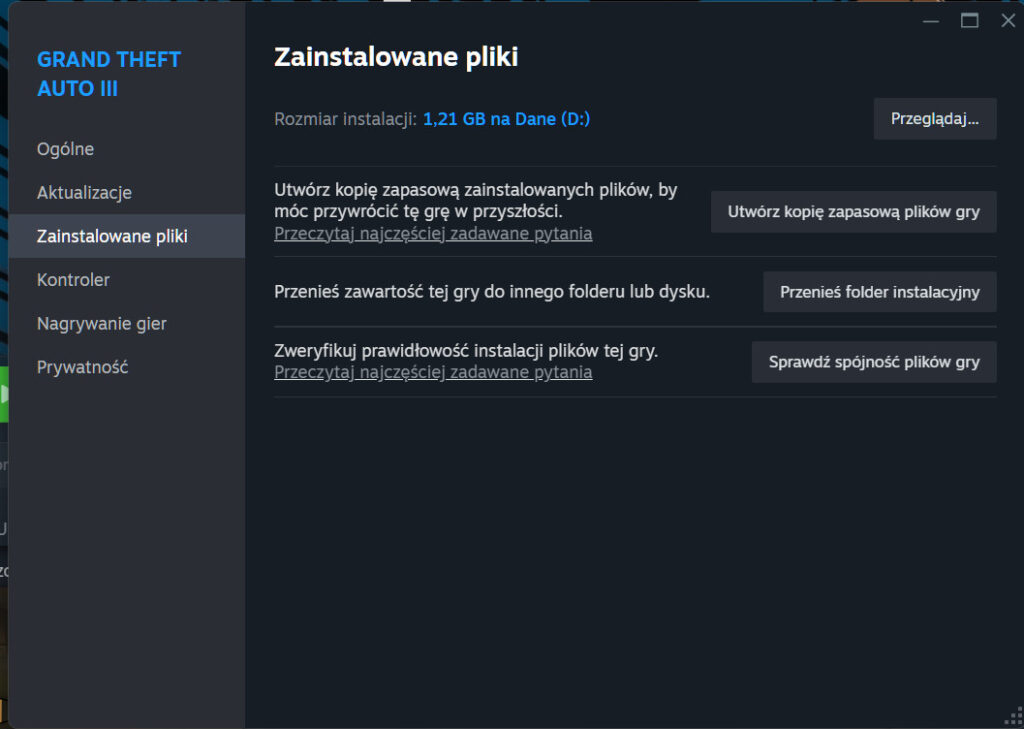 3. Z lewej strony klikamy na zakładkę: „Zainstalowane pliki”, a w tej zakładce zobaczymy pod dużym grubym napisem „Zainstalowane pliki”, pozycję: „Rozmiar instalacji”, 1,21 GB przy niej, po prawej stronie znajduje się przycisk: „Przeglądaj„. Po jego kliknięciu otworzy się nam okno systemowe, ustawione na folder z zainstalowaną grą.
