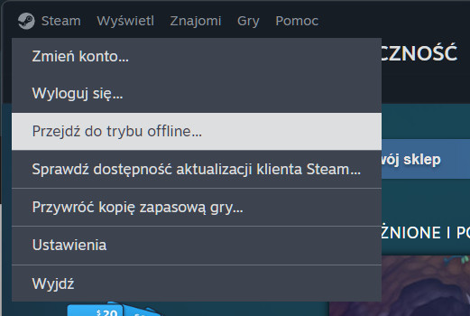 Wchodzisz w aplikację STEAM i na samej górze po lewej stronie jest przycisk STEAM, klikasz go i wybierasz opcje: „Przejdź w tryb offline”.